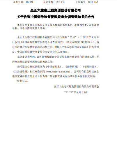 据索赔168网信息: 事实经过:9月14日晚间,*ST金正公告称,公司已于当日收到《中国证券监督管理委员会调查通知书》(鲁证调查字[2020]18号),因公司涉嫌存在信息披露违法违规行为,根据《中华人民共和国证券法》的有关规定,中国证监会决定对公司立案调查。